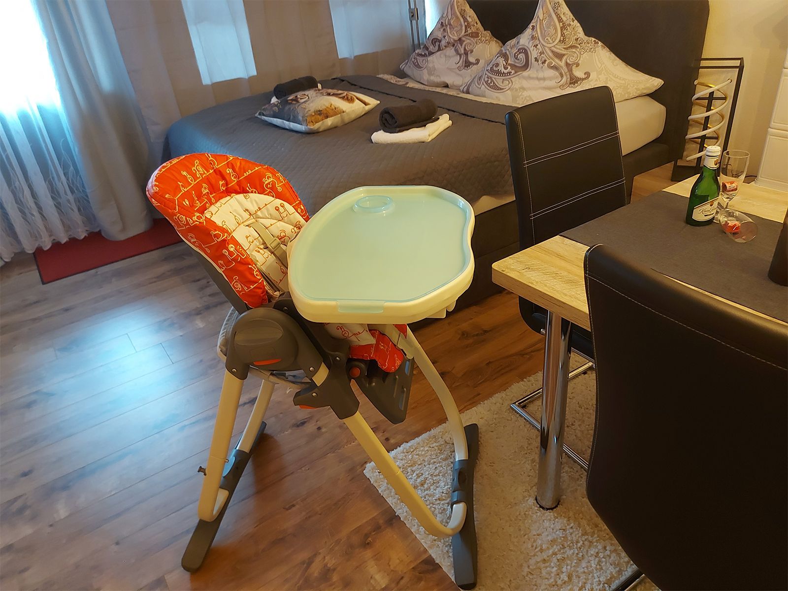 Wir stellen Ihnen ein Beistellbett zur Verfügung, wenn Ihr Kind noch nicht alleine schlafen möchte. Selbstverständlich haben wir auch einen Hochstuhl, damit die Familie in Ruhe Ihr Essen geniesen kann. Bitte nehmen Sie die Bettwäsche für das Beistellbett mit.